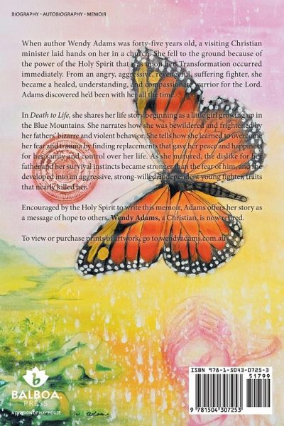 When author Wendy Adams was forty-five years old, a visiting Christian minister laid hands on her in a church. She fell to the ground because of the power of the Holy Spirit that was upon her. Transformation occurred immediately. From an angry, aggressive, revengeful, suffering fighter, she became a healed, understanding, and compassionate warrior for the Lord. Adams discovered he'd been with her all the time. In Death to Life, she shares her life story beginning as a little girl growing up in the Blue Mountains. She narrates how she was bewildered and frightened by her fathers' bizarre and violent behavior. She tells how she learned to overcome her fear and trauma by finding replacements that gave her peace and happiness for her sanity and control over her life. As she matured, the dislike for her father and her survival instincts became stronger than the fear of him, and she developed into an aggressive, strong-willed, independent young fighter, traits that nearly killed her. Encouraged by the Holy Spirit to write this memoir, Adams offers her story as a message of hope to others. Wendy Adams, a Christian, is now retired. In 2019, Death to Life won a book award in the bookexcellenceawards.com competition, becoming one of 10 finalists out of 3000 entries. To view or purchase prints of artwork, go to wendyadams.com.au The link for the book trailer on U-Tube is https://www.youtube.com/watch?v=YYazPfwBWaU.