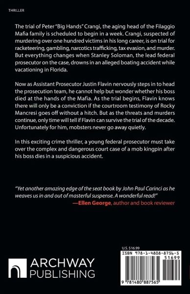 The trial of Peter "Big Hands" Crangi, the aging head of the Filaggio Mafia family is scheduled to begin in a week. Crangi, suspected of murdering over one hundred victims in his long career, is on trial for racketeering, gambling, narcotics trafficking, tax evasion, and murder. But everything changes when Stanley Soloman, the lead federal prosecutor on the case, drowns in an alleged boating accident while vacationing in Florida. Now as Assistant Prosecutor Justin Flavin nervously steps in to head the prosecution team, he cannot help but wonder whether his boss died at the hands of the Mafia. As the trial begins, Flavin knows there will only be a conviction if the courtroom testimony of Rocky Mancresi goes off without a hitch. But as the threats and murders continue, only time will tell if Flavin can survive the trial of the decade. Unfortunately for him, mobsters never go away quietly. In this exciting crime thriller, a young federal prosecutor must take over the complex and dangerous court case of a mob kingpin after his boss dies in a suspicious accident. "Yet another amazing edge of the seat book by John Paul Carinci as he weaves us in and out of masterful suspense. A wonderful read!" -Ellen George, author and book reviewer