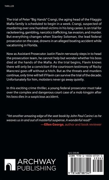 The trial of Peter "Big Hands" Crangi, the aging head of the Filaggio Mafia family is scheduled to begin in a week. Crangi, suspected of murdering over one hundred victims in his long career, is on trial for racketeering, gambling, narcotics trafficking, tax evasion, and murder. But everything changes when Stanley Soloman, the lead federal prosecutor on the case, drowns in an alleged boating accident while vacationing in Florida. Now as Assistant Prosecutor Justin Flavin nervously steps in to head the prosecution team, he cannot help but wonder whether his boss died at the hands of the Mafia. As the trial begins, Flavin knows there will only be a conviction if the courtroom testimony of Rocky Mancresi goes off without a hitch. But as the threats and murders continue, only time will tell if Flavin can survive the trial of the decade. Unfortunately for him, mobsters never go away quietly. In this exciting crime thriller, a young federal prosecutor must take over the complex and dangerous court case of a mob kingpin after his boss dies in a suspicious accident. "Yet another amazing edge of the seat book by John Paul Carinci as he weaves us in and out of masterful suspense. A wonderful read!" -Ellen George, author and book reviewer
