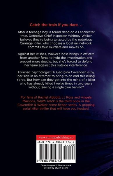 Catch the train if you dare... After a teenage boy is found dead on a Lenchester train, Detective Chief Inspector Whitney Walker believes they're being targeted by the notorious Carriage Killer, who chooses a local rail network, commits four murders, and moves on. Against her wishes, Walker's boss brings in officers from another force to help the investigation and prevent more deaths, but she's forced to defend her team against this outside interference. Forensic psychologist, Dr Georgina Cavendish, is by her side in an attempt to bring to an end this killing spree. But how can they get into the mind of a killer who has already killed twelve times in two years without leaving behind a single clue? For fans of Rachel Abbott, LJ Ross, and Angela Marsons, Death Track is the third in the Cavendish & Walker series. A gripping serial killer thriller that will have you hooked. What readers are saying about Death Track: 'This will grab you from the first chapter! A really well-constructed police procedural with two very different, strong female characters. I couldn't put this book down! The author kept me on tenterhooks right till the end. I would thoroughly recommend this book to anyone who loves a good whodunnit.' Reader review, ¿¿¿¿¿ 'I love good murder mysteries. The Walker and Cavendish series is beyond good. They are smart, very well written and somewhat addictive.' Reader review, ¿¿¿¿¿ 'The story moves at a quick pace and the main characters are intelligent, tenacious and believable. This is an excellent detective story with many twists and turns.' Reader review, ¿¿¿¿¿ 'A very well written murder mystery book... never a dull moment... Lots of exciting scenarios, with several twists/turns and a great set of unique characters to keep track of.' Reader review, ¿¿¿¿¿ 'This was a great, easy-going, interesting mystery. I enjoyed the characters and was pleasantly surprised that the ending wasn't predictable. I love a good crime book and this one was one of them.' Reader review, ¿¿¿¿¿ 'Such a quick-paced fun book to read!... I finished reading the book with a smile on my face.' Reader review, ¿¿¿¿¿