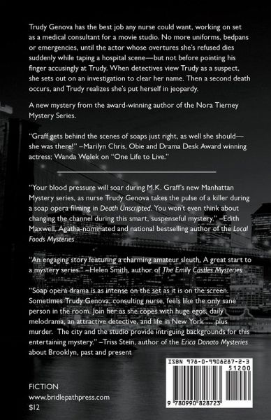 Trudy Genova has the best job any nurse could want, working onset as a medical consultant for a movie studio. No more uniforms, bedpans or emergencies, until the actor whose overtures she's refused dies suddenly while taping a hospital scene--but not before pointing his finger accusingly at Trudy. When detectives view Trudy as a suspect, she interferes with their investigation to clear her name. Then a second death occurs, and Trudy realizes she's put herself in jeopardy. Based on the author's real life work experience, Death Unscripted takes readers behind the scenes of a Manhattan soap opera. Graff gets behind the scenes of soaps just right, as well she should--she was there! Marilyn Chris, Obie and Drama Desk Award winning actress; Wanda Wolek on "One Life to Live." Your blood pressure will soar during M.K. Graff's new Manhattan Mystery series, as nurse Trudy Genova takes the pulse of a killer during a soap opera filming in DEATH UNSCRIPTED. You won't even think about changing the channel during this smart, suspenseful mystery. -Edith Maxwell, Agatha-nominated and national bestselling author of the Local Foods Mysteries "An engaging story featuring a charming amateur sleuth. A great start to a mystery series." Helen Smith, author of The Emily Castles Mysteries "Soap opera drama is as intense on the set as it is on the screen. Sometimes Trudy Genova, consulting nurse, feels like the only sane person in the room. Join her as she copes with huge egos, daily melodrama, an attractive detective, and life in New York ... plus murder. The city and the studio provide intriguing backgrounds for this entertaining mystery." Triss Stein, author of the Erica Donato mysteries about Brooklyn, past and present