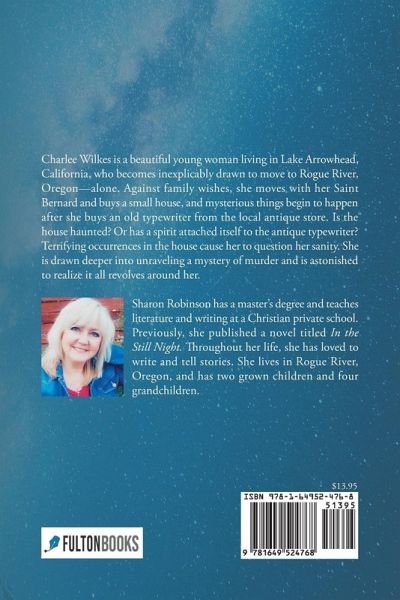 Charlee Wilkes is a beautiful young woman living in Lake Arrowhead, California, who becomes inexplicably drawn to move to Rogue River, Oregonalone. Against family wishes, she moves with her Saint Bernard and buys a small house, and mysterious things begin to happen after she buys an old typewriter from the local antique store. Is the house haunted? Or has a spirit attached itself to the antique typewriter? Terrifying occurrences in the house cause her to question her sanity. She is drawn deeper into unraveling a mystery of murder and is astonished to realize it all revolves around her.