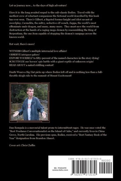 Here it is: the long awaited sequel to the cult-classic Bodies. Travel with the motleyest crew of reluctant companions the fictional world described by this book has ever seen. There's Gilbert, a bigoted former knight and idiot savant of swordplay, Carmelita, the sultry, seductive elf wench, Zappa, the world's most effeminate male dragon, and many, many more. They must save the world from destruction at the hands of a raging mega-demon by reassembling the Ring of Serpentium, the one item capable to stopping the demon's rampage across the known world. Death Wears a Big Hat picks up where Bodies left off and is nothing less than a full-throttle sleigh ride to the summit of Mount Excitement!