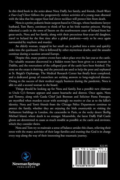 In this third book in the series about Nora Duffy, her family, and friends, Death Wears a Four-Leaf Clover follows the progressively violent activities of a young man obsessed with the idea that his copper four-leaf clover necklace will protect him from death. Nora is a petite pediatric brain surgeon based in Chicago, whose handsome lawyer husband, Tom Barry, continues to think of her as his Irish warrior princess. Having inherited a castle in the town of Sneem on the southwestern coast of Ireland from her great-uncle, Nora and her family, along with their precocious four-year-old daughter, travel to Ireland for the first time after a global pandemic--only to be once again surrounded by mayhem and murder. An elderly woman, trapped in her small car, is pushed into a mire and quickly sinks into the quicksand. This is followed by other mysterious deaths, and the assaults continue during a vacation around Europe. Despite this, many positive events have taken place over the last year at the castle. The valuable treasures discovered in a hidden room have been given to a museum in Dublin, and the renovations of the collapsed part of the castle have been finished. The store on the estate is thriving, and the proceeds are used to help the poor and orphaned at St. Brigid's Orphanage. The Medical Research Center has finally been completed, and a dedicated group of researchers are seeking answers to long-neglected diseases. Owing to the success of their medical supply business during the pandemic, Nora is able to add a second woman to the board. Things should be looking up for Nora and family, but a possible new claimant to Uncle Cy's fortune appears and causes heartache and distress. Once again, Nora and Tommy, along with Garda Chief Jack Brennan and Solicitor Fiona Finnegan, are mystified when murders occur with seemingly no motive or clue as to the killer's identity. Nora and Tom's friends from the Chicago Police Department continue to protect the family, whether they are enjoying the Irish countryside or visiting the Parliament buildings in London, the catacombs in Paris, or the rocky desert Skellig Michael Island, where death is no stranger. Meanwhile, the latest Duffy Hall Castle ghosts are determined to cause as much trouble as possible at the castle and environs, which they consider theirs. Nora and Tom try to maintain a sense of balance amidst this chaos, relieving their stress with the many activities of their large families and trusting that God is in charge every step along the way of their interesting but traumatic journey.