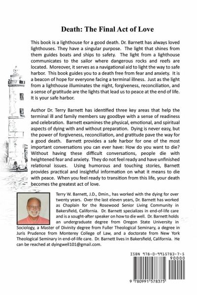 This book is a lighthouse for a good death. Dr. Barnett has always loved lighthouses. They have a singular purpose. The light that shines from them guides boats and ships to safety. The light from a lighthouse communicates to the sailor where dangerous rocks and reefs are located. Moreover, it serves as a navigational aid to light the way to safe harbor. This book guides you to a death free from fear and anxiety. It is a beacon of hope for everyone facing a terminal illness. Just as the light from a lighthouse illuminates the night, forgiveness, reconciliation, and a sense of gratitude are the lights that lead us to peace at the end of life. It is your safe harbor. Author Dr. Terry Barnett has identified three key areas that help the terminal ill and family members say goodbye with a sense of readiness and celebration. Barnett examines the physical, emotional, and spiritual aspects of dying with and without preparation. Dying is never easy, but the power of forgiveness, reconciliation, and gratitude pave the way for a good death. Barnett provides a safe harbor for one of the most important conversations you can ever have: How do you want to die? Without having these difficult conversations, people die with heighten fear and anxiety. They do not feel ready and have unfinished relational issues. Using humorous and touching stories, Barnett provides practical and insightful information on what it means to die with peace. When you feel ready to transition from this life, your death becomes the greatest act of love.