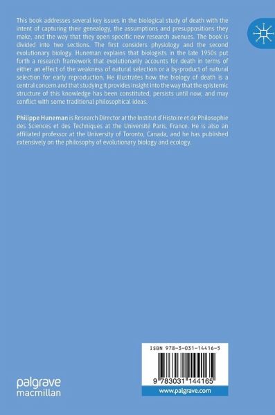This book addresses several key issues in the biological study of death with the intent of capturing their genealogy, the assumptions and presuppositions they make, and the way that they open specific new research avenues. The book is divided into two sections: the first considers physiology and the second evolutionary biology. In the first part, Huneman reconstructs a conceptual genealogy of experimental physiology based on an in-depth analysis of Bichat's investigations of death processes. In the second part he explains that biologists in the late 1950s put forth a research framework that evolutionarily accounts for death in terms of either an effect of the weakness of natural selection or a by-product of natural selection for early reproduction. He illustrates how the biology of death is a central field and that studying it provides insight into the way that the epistemic structure of this knowledge has been constituted, persists until now, and may conflict with some traditional philosophical ideas.