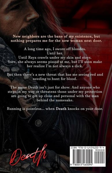 New neighbors are the bane of my existence, but nothing prepares me for the new woman next door. A long time ago, I swore off blondes. Until her. Until Raya crawls under my skin and stays. Sure, she always seems pissed at me, but I'll soon make her realize I'm not always a dick. But then there's a new threat that has me seeing red and needing to hunt for blood. The name Death isn't just for show. And anyone who steps in my way or threatens those under my protection are going to get up close and personal with the man behind the namesake. Running is pointless... when Death knocks on your door.