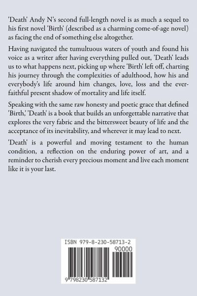 'Death' Andy N's second full-length novel is as much a sequel to his first novel 'Birth' (described as a charming come-of-age novel) as facing the end of something else altogether. Having navigated the tumultuous waters of youth and found his voice as a writer after having everything pulled out, 'Death' leads us to what happens next, picking up where 'Birth' left off, charting his journey through the complexities of adulthood, how his and everybody's life around him changes, love, loss and the ever-faithful present shadow of mortality and life itself. Speaking with the same raw honesty and poetic grace that defined 'Birth,' 'Death' is a book that builds an unforgettable narrative that explores the very fabric and the bittersweet beauty of life and the acceptance of its inevitability, and wherever it may lead to next. 'Death' is a powerful and moving testament to the human condition, a reflection on the enduring power of art, and a reminder to cherish every precious moment and live each moment like it is your last.