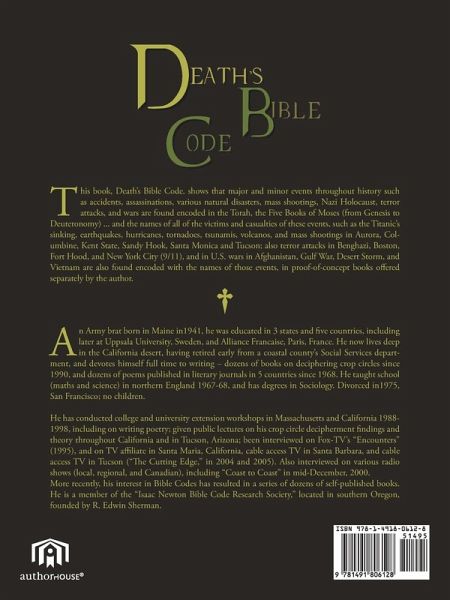 This book, Death's Bible Code. shows that major and minor events throughout history such as accidents, assassinations, various natural disasters, mass shootings, Nazi Holocaust, terror attacks, and wars are found encoded in the Torah, the Five Books of Moses (from Genesis to Deuteronomy) ... and the names of all of the victims and casualties of these events, such as the Titanic's sinking, earthquakes, hurricanes, tornadoes, tsunamis, volcanos, and mass shootings in Aurora, Columbine, Kent State, Sandy Hook, Santa Monica and Tucson; also terror attacks in Benghazi, Boston, Fort Hood, and New York City (9/11), and in U.S. wars in Afghanistan, Gulf War, Desert Storm, and Vietnam are also found encoded with the names of those events, in proof-of-concept books offered separately by the author.