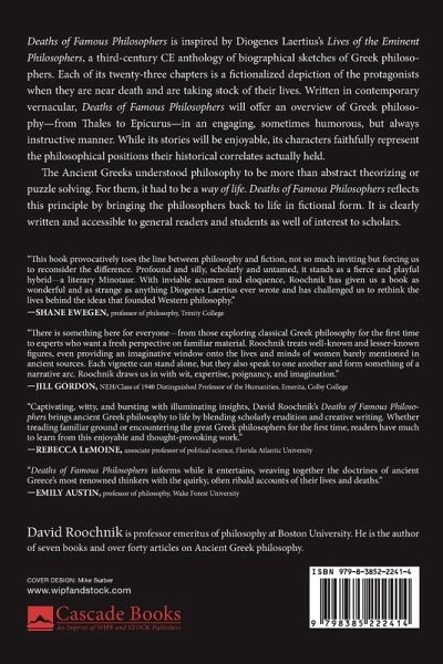 Deaths of Famous Philosophers is inspired by Diogenes Laertius's Lives of the Eminent Philosophers, a third-century CE anthology of biographical sketches of Greek philosophers. Each of its twenty-three chapters is a fictionalized depiction of the protagonists when they are near death and are taking stock of their lives. Written in contemporary vernacular, Deaths of Famous Philosophers will offer an overview of Greek philosophy--from Thales to Epicurus--in an engaging, sometimes humorous, but always instructive manner. While its stories will be enjoyable, its characters faithfully represent the philosophical positions their historical correlates actually held. The Ancient Greeks understood philosophy to be more than abstract theorizing or puzzle solving. For them, it had to be a way of life. Deaths of Famous Philosophers reflects this principle by bringing the philosophers back to life in fictional form. It is clearly written and accessible to general readers and students as well of interest to scholars.