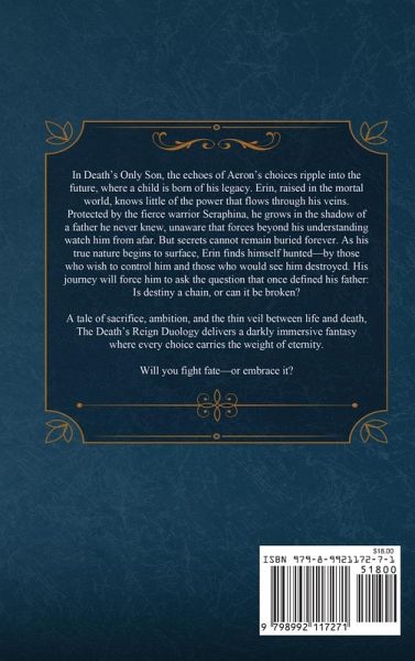 In Death's Only Son, the echoes of Aeron's choices ripple into the future, where a child is born of his legacy. Erin, raised in the mortal world, knows little of the power that flows through his veins. Protected by the fierce warrior Seraphina, he grows in the shadow of a father he never knew, unaware that forces beyond his understanding watch him from afar. But secrets cannot remain buried forever. As his true nature begins to surface, Erin finds himself hunted-by those who wish to control him and those who would see him destroyed. His journey will force him to ask the question that once defined his father: Is destiny a chain, or can it be broken? A tale of sacrifice, ambition, and the thin veil between life and death, The Death's Reign Duology delivers a darkly immersive fantasy where every choice carries the weight of eternity.Will you fight fate-or embrace it?