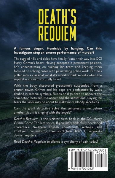 A famous singer. Homicide by hanging. Can this investigator stop an encore performance of murder? The rugged hills and dales have finally found their way into DCI Harry Grimm's heart. Having accepted a permanent position, he's concentrating on building his team and keeping them focused on solving cases with painstaking police work. But he's pulled into a classical vocalist's world of dark secrets when the superstar chorist is brutally killed. With the body discovered gruesomely suspended from a church tower, Grimm and his cops are confronted by walls daubed in satanic symbols. But as he digs deep to uncover the connection between the occult and the sensational slaying, he fears the killer may be about to make more bloody sacrifices. Can the gruff detective solve the senseless crime before another victim is singing with the angels? Death's Requiem is the sinister sixth book in the DCI Harry Grimm Crime Thrillers series. If you like wonderfully developed characters, Northern English countryside settings, and intelligent conundrums, then you'll love David J. Gatward's devilish mystery. Buy Death's Requiem to silence a symphony of pain today! Death's Requiem is the sixth book in the DCI Harry Grimm crime thriller series, set in the Yorkshire Dales, and perfect for fans of L. J. Ross, J.R. Ellis, Margaret Mayhew, Jeanne M. Dams, J. M. Dalgliesh, Roger Silverwood, J. D. Kirk, Adam Croft, Alex Smith, and Simon McCleave.