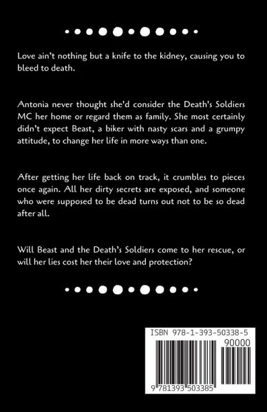 Antonia: Love ain't nothing but a knife to the kidney, causing you to bleed to death. ¿ My twin brother's love for me was what got him killed. Joshua was the best brother any girl could have wished for. We grew up thick as thieves. Now, I live every day with the guilt of his death. ¿ After my brother's untimely death, I swore I'd never be weak and helpless again. ¿ The only person I care for is my best friend and sister by choice, Quinn. But even her, I keep secrets from. ¿ It was never my plan to settle down in Lineville, Arizona. I never thought the day would come when I would call an outlaw motorcycle club for my family. I most certainly didn't expect Beast, that bastard biker with nasty scars and a sexy smirk, to change my life in more ways than one. ¿ I was starting to get my life back on track when it crumbled to pieces once again. All my dirty secrets were revealed, and someone who was supposed to be dead turned out not to be so dead after all. ¿ Will Beast and the Death's Soldiers come to my rescue, or will my lies cost me their love and protection? ¿ Beast: My first kill was my own father. He was an abusive son-of-a-bitch who got what he deserved. ¿ I devoted my twenties to be a sniper in the Special Forces. I was damn good at my job until I was dishonorably discharged. Now, I'm the Sergeant-at-Arms of the Death's Soldiers MC. ¿ I've spent my life doing the dirty work nobody else wants to do. I have no inner quarrels with it. Unlike others, I crave killing. I need to cause people pain to be able to breathe. ¿ My head is swarmed with the nightmares that I've lived through. I got the scars on my chest, back, and face to prove it. Not to mention an injured knee that causes me to limp like a cripple on my worst days. ¿ I am a Beast. ***** This is the second book in the Death's Soldiers MC Series. Can be read as a standalone. Trigger warnings: profanity, sexually explicit scenes, graphic violence