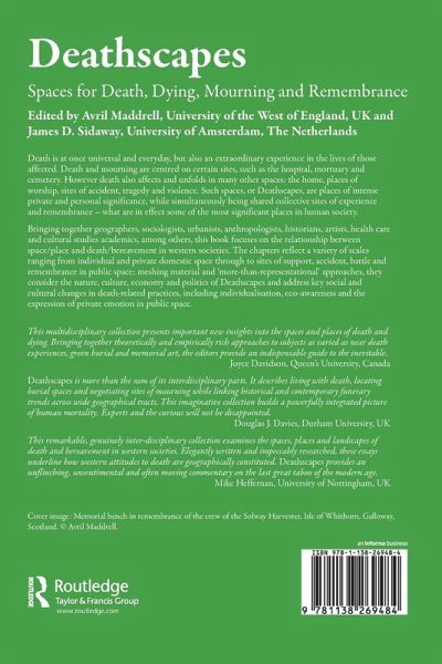 Death is at once a universal and everyday, but also an extraordinary experience in the lives of those affected. Death and bereavement are thereby intensified at (and frequently contained within) certain sites and regulated spaces, such as the hospital, the cemetery and the mortuary. However, death also affects and unfolds in many other spaces: the home, public spaces and places of worship, sites of accident, tragedy and violence. Such spaces, or Deathscapes, are intensely private and personal places, while often simultaneously being shared, collective, sites of experience and remembrance; each place mediated through the intersections of emotion, body, belief, culture, society and the state. Bringing together geographers, sociologists, anthropologists, cultural studies academics and historians among others, this book focuses on the relationships between space/place and death/ bereavement in 'western' societies. Addressing three broad themes: the place of death; the place of final disposition; and spaces of remembrance and representation, the chapters reflect a variety of scales ranging from the mapping of bereavement on the individual or in private domestic space, through to sites of accident, battle, burial, cremation and remembrance in public space. The book also examines social and cultural changes in death and bereavement practices, including personalisation and secularisation. Other social trends are addressed by chapters on green and garden burial, negotiating emotion in public/ private space, remembrance of violence and disaster, and virtual space. A meshing of material and 'more-than-representational' approaches consider the nature, culture, economy and politics of Deathscapes - what are in effect some of the most significant places in human society.