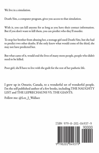 We live in a simulation. Death/Site, a computer program, gives you access to that simulation. With it, you can kill anyone for as long as you have their contact information. But if you don't want to kill them, you can predict who they'll murder. To stop her brother from abusing her, a teenage girl used death/site, but she had to predict two other deaths. If she only knew what would come of the third, she may not have predicted her. But what came of it would end the lives of many more people, people who didn't need to be killed. Poor girl; she'll have to live with the guilt for the rest of her pathetic life.
