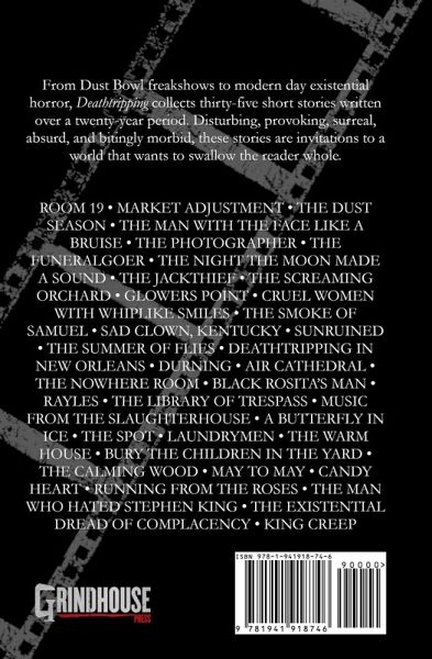 From Dust Bowl freakshows to modern day existential horror, Deathtripping collects thirty-five short stories written over a twenty-year period. Disturbing, provoking, surreal, absurd, and bitingly morbid, these stories are invitations to a world that wants to swallow the reader whole. Contains the following stories: ROOM 19 ¿ MARKET ADJUSTMENT ¿ THE DUST SEASON ¿ THE MAN WITH THE FACE LIKE A BRUISE ¿ THE PHOTOGRAPHER ¿ THE FUNERALGOER ¿ THE NIGHT THE MOON MADE A SOUND ¿ THE JACKTHIEF ¿ THE SCREAMING ORCHARD ¿ GLOWERS POINT ¿ CRUEL WOMEN WITH WHIPLIKE SMILES ¿ THE SMOKE OF SAMUEL ¿ SAD CLOWN, KENTUCKY ¿ SUNRUINED ¿ THE SUMMER OF FLIES ¿ DEATHTRIPPING IN NEW ORLEANS ¿ DURNING ¿ AIR CATHEDRAL ¿ THE NOWHERE ROOM ¿ BLACK ROSITA'S MAN ¿ RAYLES ¿ THE LIBRARY OF TRESPASS ¿ MUSIC FROM THE SLAUGHTERHOUSE ¿ A BUTTERFLY IN ICE ¿ THE SPOT ¿ LAUNDRYMEN ¿ THE WARM HOUSE ¿ BURY THE CHILDREN IN THE YARD ¿ THE CALMING WOOD ¿ MAY TO MAY ¿ CANDY HEART ¿ RUNNING FROM THE ROSES ¿ THE MAN WHO HATED STEPHEN KING ¿ THE EXISTENTIAL DREAD OF COMPLACENCY ¿ KING CREEP
