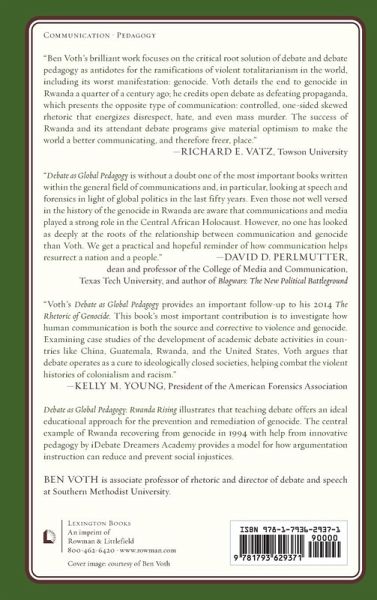 Debate as Global Pedagogy: Rwanda Rising illustrates that the teaching of debate offers an ideal educational approach for the prevention and remediation of genocide. As the antithesis of propaganda, debate and argument instruction promotes the critical thinking necessary to resist processes of propaganda that enable injustice and human rights abuses. Case studies of argumentation instruction and deliberative forums worldwide demonstrate how environments of discursive complexity can be fostered through education in debate and argumentation. The central example of Rwanda recovering from genocide in 1994 with help from innovative pedagogy by iDebate Dreamers Academy provides a model for how argumentation instruction can reduce and prevent social injustices.