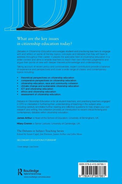 What are the key issues in Citizenship Education today? Debates in Citizenship Education encourages student and practising teachers to engage with and reflect on some of the key topics, concepts and debates that they will have to address throughout their career. It places the specialist field of Citizenship Education in a wider context and aims to enable teachers to reach their own informed judgements and argue their points of view with deeper theoretical knowledge and understanding. Taking account of recent policy and controversies, expert contributors provide a balance of experience and perspectives and cover a wide range of classic and contemporary topics including: Theoretical Perspectives on Citizenship Education; International Comparative Perspectives on Citizenship Education; Citizenship Education, Race and Community Cohesion; Climate Change and Sustainable Citizenship Education; ICT and Citizenship Education; Ethics and Citizenship Education; Assessment of Citizenship Education. Debates in Citizenship Education is for all student teachers, and practising teachers engaged in CPD or interested in furthering their understanding of teaching in the subject area. Including carefully annotated further reading and reflective questions to help shape your own research and writing, this collection provides an introduction to recent critical thinking and contemporary debates within Citizenship Education.