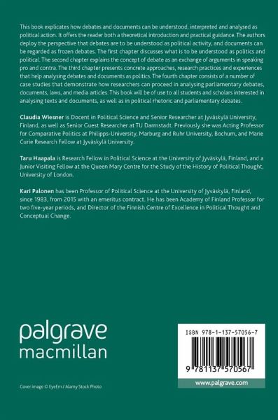 This book explicates how debates and documents can be understood, interpreted and analysed as political action. It offers the reader both a theoretical introduction and practical guidance. The authors deploy the perspective that debates are to be understood as political activity, and documents can be regarded as frozen debates. The first chapter discusses what is to be understood as politics and political. The second chapter explains the concept of debate as an exchange of arguments in speaking pro and contra. The third chapter presents concrete approaches, research practices and experiences that help analysing debates and documents as politics. The fourth chapter consists of a number of case studies that demonstrate how researchers can proceed in analysing parliamentary debates, documents, laws, and media articles. This book will be of use to all students and scholars interested in analysing texts and documents, as well as in political rhetoric and parliamentary debates.