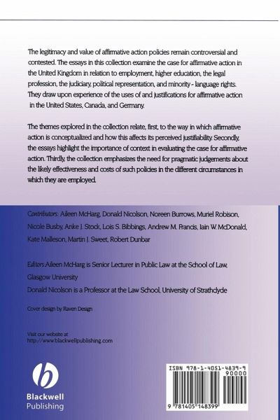 The legitimacy and value of affirmative action policies remain controversial and contested. The essays in this collection examine the case for affirmative action in the UK in relation to employment, higher education, the legal profession, the judiciary, political representation, and minority language rights. They draw upon experience of the uses of and justifications for affirmative action in the United States, Canada, and Germany. The themes explored in the collection relate, first, to the way in which affirmative action is conceptualized and how this affects its perceived justifiability. Secondly, the essays highlight the importance of context in evaluating the case for affirmative action. Thirdly, the collection emphasises the need for pragmatic judgments about the likely effectiveness and costs of such policies in the different circumstances in which they are employed.