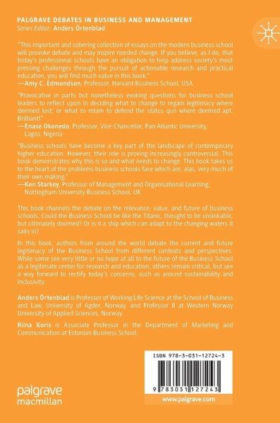 This book channels the debate on the relevance, value, and future of business schools. Could the Business School be like the Titanic, thought to be unsinkable, but ultimately doomed? And if it sinks, what of it? Or is it a ship which can adapt to the changing waters it sails in? In this book, authors from around the world debate the current and future legitimacy of the Business School from different contexts and perspectives. While some see very little or no hope at all to the future of the Business School as a legitimate centre for research and education, others remain critical, but see a way forward to rectify today's concerns, such as around sustainability and inclusivity. This book highlights to readers thought-provoking complexities on the Business School playground and its legitimacy.