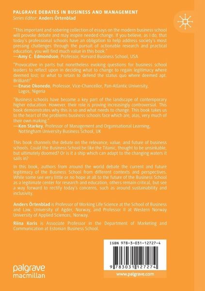 This book channels the debate on the relevance, value, and future of business schools. Could the Business School be like the Titanic, thought to be unsinkable, but ultimately doomed? And if it sinks, what of it? Or is it a ship which can adapt to the changing waters it sails in? In this book, authors from around the world debate the current and future legitimacy of the Business School from different contexts and perspectives. While some see very little or no hope at all to the future of the Business School as a legitimate centre for research and education, others remain critical, but see a way forward to rectify today's concerns, such as around sustainability and inclusivity. This book highlights to readers thought-provoking complexities on the Business School playground and its legitimacy.
