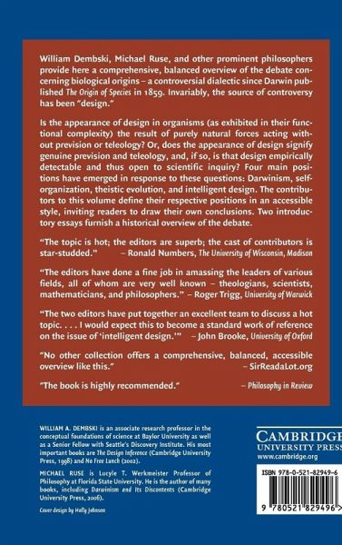 Introduction: General introduction William Dembski and Michael Ruse; The argument from design: a brief history Michael Ruse; Who's afraid of ID? A survey of the intelligent design movement Angus Menuge; Part I. Darwinism: 1. Design with designer: Darwin's greatest discovery Francisco Ayala; 2. The flagellum unspun: the collapse of 'irreducible complexity' Kenneth Miller; 3. The design argument Elliott Sober; 4. DNA by design? Stephen Meyer and the return of the god hypothesis Robert Pennock; Part II. Complex Self-Organization: 5. Prolegomenon to a general biology Stuart Kauffman; 6. Darwinism, design and complex systems dynamics David Depew and Bruce Weber; 7. Emergent complexity, teleology, and the arrow of time Paul Davies; 8. The emergence of biological value James Barham; Part III. Theistic Evolution: 9. Darwin, design and divine providence John Haught; 10. The inbuilt potentiality of creation John Polkinghorne; 11. Theistic evolution Keith Ward; 12. Intelligent design: some geological, historical and theological questions Michael Roberts; 13. The argument from laws of nature reassessed Richard Swinburne; Part IV. Intelligent Design: 14. The logical underpinnings of intelligent design William Dembski; 15. Information, entropy and the origin of life Walter Bradley; 16. Irreducible complexity: obstacle to Darwinian evolution Michael Behe; 17. The Cambrian information explosion: evidence for intelligent design Stephen Meyer.
