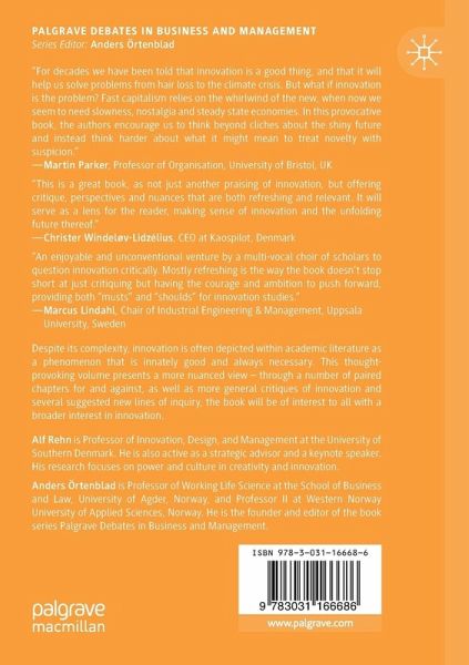Part I. Innovation - Where We Are and How We Got Here.- Chapter 1. Introduction, Alf Rehn and Anders Örtenblad.- Chapter 2. Innovation, Labor Displacement, and the Role of the State: The Classical Economists' Perspective, Samuel Hollander.- Chapter 3. Innovation Ethics, Thomas Taro Lennerfors and Kiyoshi Murata.- Part II. Some General Critiques of Innovation.- Chapter 4. Creative Continuation-An Alternative Perspective on Innovation and Society, Jon P. Knudsen.- Chapter 5. Image, Imperatives, and Ideology in the Innovation Industry, Alf Rehn.- Part III. For and Against Business Model Innovation.- Chapter 6. In Search for the Holy Grail in Management Research: A Review of the Benefits of Business Model Innovation, Thomas Clauß.- Chapter 7. A Critique of Business Model Innovation, La Ode Sabaruddin and Fathiro Hutama Reksa Putra.- Part IV. For and Against Social Innovation.- Chapter 8. The Pros of Social Innovation, Luis Rubalcaba and Ernesto Solano.- Chapter 9. Against Social Innovation, Nidhi Srinivas.- Part V. For and Against Service Innovation.- Chapter 10. For Service Innovation: Some Arguments in Favor of Services and Innovation in Services, Faridah Djellal, Camal Gallouj, and Faïz Gallouj.- Chapter 11. Against Service Innovation: Why Service Innovation is Not Sustainable, Lars Witell, Per Carlborg, and Hannah Snyder.- Part VI. For and Against Open Innovation.- Chapter 12. For Open Innovation, Lykke Margot Ricard and Sergio Jofre.- Chapter 13. What Could Possibly Go Wrong? Reflections on Potential Challenges of Open Innovation, Pia Hurmelinna-Laukkanen, Ioana Stefan, and Jialei Yang.- Part VII. The Road Forward From Here.- Chapter 14. What Does It Take? Feminist Readings of Innovation Studies, Sine N. Just and Sara Dahlman.- Chapter 15. Non-western perspectives on innovation, Abhinav Chaturvedi.- Chapter 16. Innovation, AI, and Materiality: Learning from the Arts, Astrid Huopalainen.- Chapter 17. Peace Piece: On the Machiavellian Moment in Organizational Innovation, Karl Palmås and Stefan Molnar.- Chapter 18. The Animal Spirits of Innovation: On Companion Species, Creativity, and Olly the Airport Cat, Damian O'Doherty.- Chapter 19. The Future(s) of Innovation, Alf Rehn.