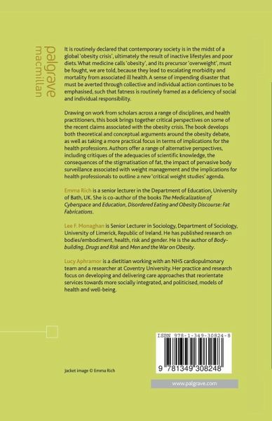 This book brings together critical perspectives on some of the recent claims associated with the obesity crisis. It develops both theoretical and conceptual arguments around the obesity debate, as well as taking a more practical focus in terms of implications for the health professions to outline an agenda for a 'critical weight studies'.