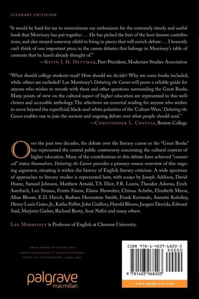 "Debating the Canon" is a one-stop collection of the most important conversations regarding the development and future of the literary canon, with essays by T.S. Eliot, David Hume, Samuel Johnson, Leo Strauss, Elaine Showalter, Harold Bloom, Elizabeth Meese, and Henry Louis Gates to name but a few. Over the past two decades, the debate over the Great Books has been the central public controversy concerning the cultural content of higher education. "Debating the Canon" provides the first primary-source overview of these ongoing arguments. Many of these contributions to this debate have achieved "canonical" status themselves. Through their focus on the canon, the full spectrum of approaches to literary studies is represnted here. This collection places the recent debate within a larger context of literary criticism's development of a canon, going back to the eighteenth century. Morrissey's introductions provide context for the conversations, and together comprise a history of the debate over the Great Books.