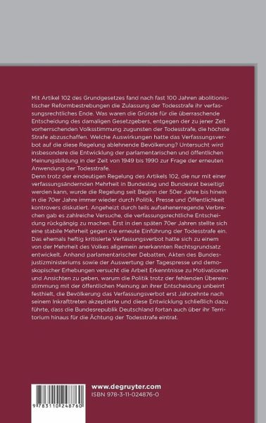 Mit Artikel 102 des Grundgesetzes fand nach fast 100 Jahren abolitionistischer Reformbestrebungen die Zulassung der Todesstrafe ihr verfassungsrechtliches Ende. Was waren die Gründe für die überraschende Entscheidung des damaligen Gesetzgebers, entgegen der zu jener Zeit vorherrschenden Volksstimmung zugunsten der Todesstrafe, die höchste Strafe abzuschaffen. Welche Auswirkungen hatte das Verfassungsverbot auf die diese Regelung ablehnende Bevölkerung? Untersucht wird insbesondere die Entwicklung der parlamentarischen und öffentlichen Meinungsbildung in der Zeit von 1949 bis 1990 zur Frage der erneuten Anwendung der Todesstrafe. Denn trotz der eindeutigen Regelung des Artikels 102, die nur mit einer verfassungsändernden Mehrheit in Bundestag und Bundesrat beseitigt werden kann, wurde die Regelung seit Beginn der 50er Jahre bis hinein in die 70er Jahre immer wieder durch Politik, Presse und Öffentlichkeit kontrovers diskutiert. Angeheizt durch teils aufsehenerregende Verbrechen gab es zahlreiche Versuche, die verfassungsrechtliche Entscheidung rückgängig zu machen. Erst in den späten 70er Jahren stellte sich eine stabile Mehrheit gegen die erneute Einführung der Todesstrafe ein. Das ehemals heftig kritisierte Verfassungsverbot hatte sich zu einem von der Mehrheit des Volkes allgemein anerkannten Rechtsgrundsatz entwickelt. Anhand parlamentarischer Debatten, Akten des Bundesjustizministeriums sowie der Auswertung der Tagespresse und demoskopischer Erhebungen versucht die Arbeit Erkenntnisse zu Motivationen und Ansichten zu geben, warum die Politik trotz der fehlenden Übereinstimmung mit der öffentlichen Meinung an ihrer Entscheidung unbeirrt festhielt, die Bevölkerung das Verfassungsverbot erst Jahrzehnte nach seinem Inkrafttreten akzeptierte und diese Entwicklung schließlich dazu führte, dass die Bundesrepublik Deutschland fortan auch über ihr Territorium hinaus für die Ächtung der Todesstrafe eintrat.