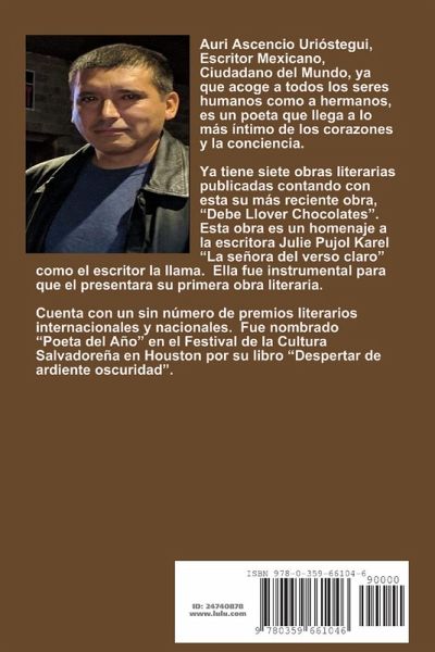 Auri Ascencio Urióstegui, Escritor Mexicano, Ciudadano del Mundo, ya que acoge a todos los seres humanos como a hermanos, es un poeta que llega a lo más íntimo de los corazones y la conciencia. Ya tiene siete obras literarias publicadas contando con esta su más reciente obra, "Debe Llover Chocolates". Esta obra es un homenaje a la escritora Julie Pujol Karel "La señora del verso claro" como el escritor la llama. Ella fue instrumental para que el presentara su primera obra literaria.