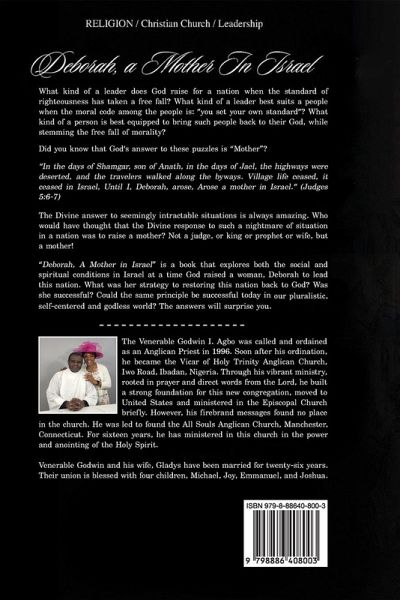 What kind of a leader does God raise for a? Could the same principle be successful today in our pluralistic, self-centered and godless world? The answers will surprise you. nation when the standard of righteousness has taken a free fall? What kind of a leader best suits a people when the moral code among the people is: "you set your own standard"? What kind of a person is best equipped to bring such people back to their God, while stemming the free fall of morality? Did you know that God's answer to these puzzles is "Mother"? "In the days of Shamgar, son of Anath, in the days of Jael, the highways were deserted, and the travelers walked along the byways. Village life ceased, it ceased in Israel, Until I, Deborah, arose, Arose a mother in Israel." (Judges 5:6-7) The Divine answer to seemingly intractable situations is always amazing. Who would have thought that the Divine response to such a nightmare of situation in a nation was to raise a mother? Not a judge, or king or prophet or wife, but a mother! "Deborah, A Mother in Israel" is a book that explores both the social and spiritual conditions in Israel at a time God raised a woman, Deborah to lead this nation. What was her strategy to restoring this nation back to God? Was she successful