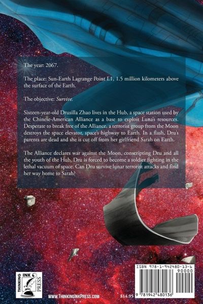 The year: 2067 The place: Sun-Earth Lagrange Point L1, 1.5 million kilometers above the surface of the Earth The objective: Survive Sixteen-year-old Drusilla Zhao lives in the Hub, a space station used by the Chinese-American Alliance as a base to exploit Luna's resources. Desperate to break free of the Alliance, a terrorist group from the Moon destroys the space elevator, space's highway to Earth. In a flash, Dru's parents are dead and she is cut off from her girlfriend Sarah on Earth. The Alliance declares war against the Moon, conscripting Dru and all the youth of the Hub. Dru is forced to become a soldier fighting in the lethal vacuum of space. Can Dru survive lunar terrorist attacks and find her way home to Sarah?