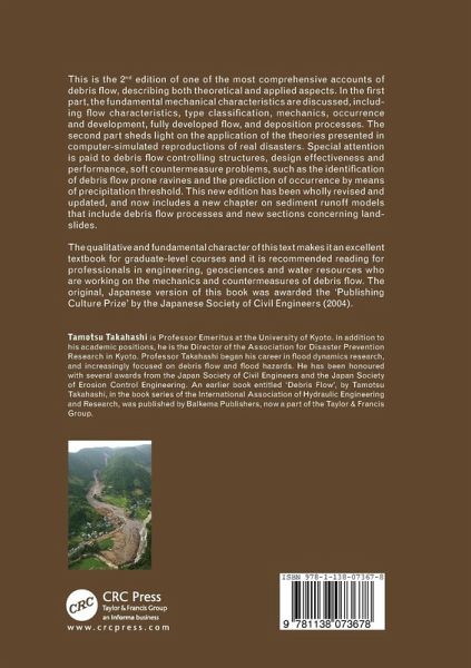 This is the 2nd edition of one of the most comprehensive accounts of debris flow, describing both theoretical and applied aspects. In the first part, the fundamental mechanical characteristics are discussed, including flow characteristics, type classification, mechanics, occurrence and development, fully developed flow, and deposition processes. The second part sheds light on the application of the theories presented in computer-simulated reproductions of real disasters. Special attention is paid to debris flow controlling structures, design effectiveness and performance, soft countermeasure problems, such as the identification of debris flow prone ravines and the prediction of occurrence by means of precipitation threshold. This new edition has been wholly revised and updated, and now includes a new chapter on sediment runoff models that include debris flow processes and new sections concerning landslides. The qualitative and fundamental character of this text makes it an excellent textbook for graduate-level courses and it is recommended reading for professionals in engineering, geosciences and water resources who are working on the mechanics and countermeasures of debris flow. The original, Japanese version of this book was awarded the 'Publishing Culture Prize' by the Japanese Society of Civil Engineers (2004). Tamotsu Takahashi is Professor Emeritus at the University of Kyoto. In addition to his academic positions, he is the Director of the Association for Disaster Prevention Research in Kyoto. Professor Takahashi began his career in flood dynamics research, and increasingly focused on debris flow and flood hazards. He has been honoured with several awards from the Japan Society of Civil Engineers and the Japan Society of Erosion Control Engineering. An earlier book entitled 'Debris Flow', by Tamotsu Takahashi, in the book series of the International Association of Hydraulic Engineering and Research, was published by Balkema Publishers, now a part of the Taylor & Francis Group.