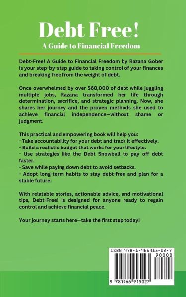 Debt-Free! A Guide to Financial Freedom by Razana Gober is your step-by-step guide to taking control of your finances and breaking free from the weight of debt. Once overwhelmed by over $60,000 of debt while juggling multiple jobs, Razana transformed her life through determination, sacrifice, and strategic planning. Now, she shares her journey and the proven methods she used to achieve financial independence-without shame or judgment. This practical and empowering book will help you: - Take accountability for your debt and track it effectively. - Build a realistic budget that works for your lifestyle. - Use strategies like the Debt Snowball to pay off debt faster. - Save while paying down debt to avoid setbacks. - Adopt long-term habits to stay debt-free and plan for a stable future. With relatable stories, actionable advice, and motivational tips, Debt-Free! is designed for anyone ready to regain control and achieve financial peace. Your journey starts here-take the first step today!