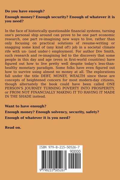 Do you have enough? Enough money? Enough security? Enough of whatever it is you need? In the face of historically questionable financial systems, turning one's personal ship around can prove to be one part economic research, one part re-imagining new ways to live, rather than only focusing on practical solutions of resume-writing or snagging some kind of (any kind of!) job in a societal climate rife with un- (and under-) employment. For author Dre Smith, such research and re-imagining led to the discovery that some people in this day and age (even in first-world countries) have figured out how to live pretty well despite today's less-than-healthy monetary paradigm. Some folks have even figured out how to survive using almost no money at all. The explorations fall under the title DEBT, MONEY, WEALTH since these are concepts of heightened concern for most modern-day citizens, though alternately the book could have been called ONE PERSON'S JOURNEY TURNING POVERTY INTO PROSPERITY, or FROM NOT FINANCIALLY MAKING IT TO HAVING IT MADE IN THE SHADE instead. Want to have enough? Enough money? Enough solvency, security, safety? Enough of whatever it is you need? Read on.