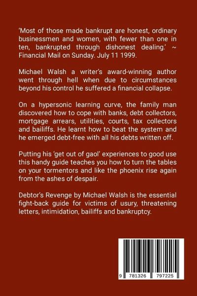 'Most of those made bankrupt are honest, ordinary businessmen and women, with fewer than one in ten, bankrupted through dishonest dealing.' ~ Financial Mail on Sunday. July 11 1999. Michael Walsh a writer's award-winning author went through hell when due to circumstances beyond his control he suffered a financial collapse. On a hypersonic learning curve, the family man discovered how to cope with banks, debt collectors, mortgage arrears, utilities, courts, tax collectors and bailiffs. He learnt how to beat the system and he emerged debt-free with all his debts written off. Putting his 'get out of gaol' experiences to good use this handy guide teaches you how to turn the tables on your tormentors and like the phoenix rise again from the ashes of despair. Debtor's Revenge by Michael Walsh is the essential fight-back guide for victims of usury, threatening letters, intimidation, bailiffs and bankruptcy.