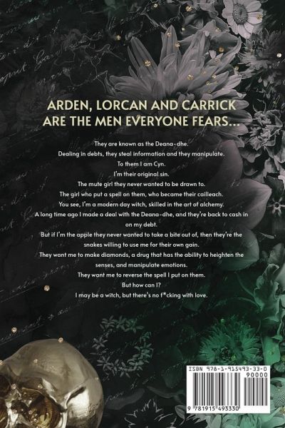 Arden, Lorcan and Carrick are the men everyone fears... They are known as the Deana-dhe. Dealing in debts, they steal information and they manipulate. To them I am Cyn. I'm their original sin. The mute girl they never wanted to be drawn to. The girl who put a spell on them, who became their cailleach. You see, I'm a modern day witch, skilled in the art of alchemy. A long time ago I made a deal with the Deana-dhe, and they're back to cash in on my debt. But if I'm the apple they never wanted to take a bite out of, then they're the snakes willing to use me for their own gain. They want me to make diamonds, a drug that has the ability to heighten the senses, and manipulate emotions. They want me to reverse the spell I put on them. But how can I? I may be a witch, but there's no f*cking with love.