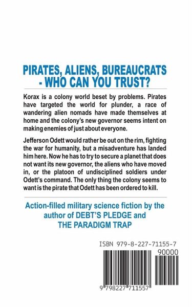 PIRATES, ALIENS, BUREAUCRATS - WHO CAN YOU TRUST? Korax is a colony world beset by problems. Pirates have targeted the world for plunder, a race of wandering alien nomads have made themselves at home and the colony's new governor seems intent on making enemies of just about everyone. Jefferson Odett would rather be out on the rim, fighting the war for humanity, but a misadventure has landed him here. Now he has to try to secure a planet that does not want its new governor, the aliens who have moved in, or the platoon of undisciplined soldiers under Odett's command. The only thing the colony seems to want is the pirate that Odett has been ordered to kill. Action-filled military science fiction by the author of DEBT'S PLEDGE and THE PARADIGM TRAP