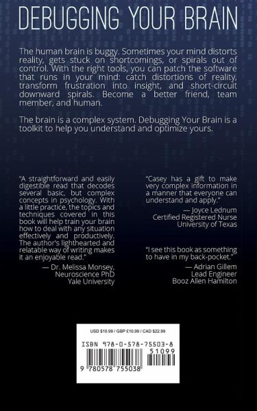 The human brain is buggy. Sometimes your mind distorts reality, gets frustrated with shortcomings, and spirals out of control. With practice, you can debug your brain. Catch those distortions of reality, transform those frustrations into insight, and short-circuit those downward spirals. Debugging Your Brain (DYB) is a clear applied psychology book and a concise self-help book. Whether or not you have a technical background, you will find the software development analogies approachable and insightful. You will likely reference and re-read DYB many times, each time discovering new insights. DYB is full of practical techniques. Each technique is condensed to its core idea, accompanied by just enough story to make it memorable. Each chapter has activities to help you put its techniques into practice. The chapters include: Modeling The Brain, Cognitive Behavioral Therapy, Introspection, Identifying Inputs, Experience Processing, Experience Validation, and Cognitive Restructuring. Your brain is a complex system. Patch the software that runs in your mind.