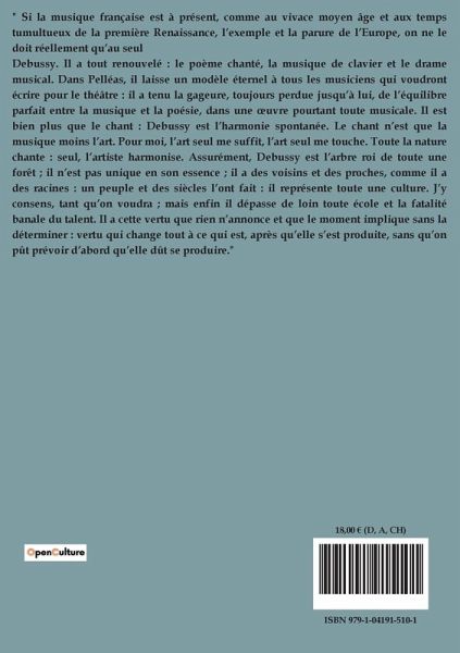 " Si la musique française est à présent, comme au vivace moyen âge et aux temps tumultueux de la première Renaissance, l¿exemple et la parure de l¿Europe, on ne le doit réellement qüau seul Debussy. Il a tout renouvelé : le poème chanté, la musique de clavier et le drame musical. Dans Pelléas, il laisse un modèle éternel à tous les musiciens qui voudront écrire pour le théâtre : il a tenu la gageure, toujours perdue jusqüà lui, de l¿équilibre parfait entre la musique et la poésie, dans une ¿uvre pourtant toute musicale. Il est bien plus que le chant : Debussy est l¿harmonie spontanée. Le chant n¿est que la musique moins l¿art. Pour moi, l¿art seul me suffit, l¿art seul me touche. Toute la nature chante : seul, l¿artiste harmonise. Assurément, Debussy est l¿arbre roi de toute une forêt ; il n¿est pas unique en son essence ; il a des voisins et des proches, comme il a des racines : un peuple et des siècles l¿ont fait : il représente toute une culture. J¿y consens, tant qüon voudra ; mais enfin il dépasse de loin toute école et la fatalité banale du talent. Il a cette vertu que rien n¿annonce et que le moment implique sans la déterminer : vertu qui change tout à ce qui est, après qüelle s¿est produite, sans qüon pût prévoir d¿abord qüelle dût se produire."