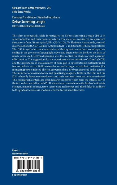 This monograph solely investigates the Debye Screening Length (DSL) in semiconductors and their nano-structures. The materials considered are quantized structures of non-linear optical, III-V, II-VI, Ge, Te, Platinum Antimonide, stressed materials, Bismuth, GaP, Gallium Antimonide, II-V and Bismuth Telluride respectively. The DSL in opto-electronic materials and their quantum confined counterparts is studied in the presence of strong light waves and intense electric fields on the basis of newly formulated electron dispersion laws that control the studies of such quantum effect devices. The suggestions for the experimental determination of 2D and 3D DSL and the importance of measurement of band gap in optoelectronic materials under intense built-in electric field in nano devices and strong external photo excitation (for measuring photon induced physical properties) have also been discussed in this context. The influence of crossed electric and quantizing magnetic fields on the DSLand the DSL in heavily doped semiconductors and their nanostructures has been investigated. This monograph contains 150 open research problems which form the integral part of the text and are useful for both PhD students and researchers in the fields of solid-state sciences, materials science, nano-science and technology and allied fields in addition to the graduate courses in modern semiconductor nanostructures.