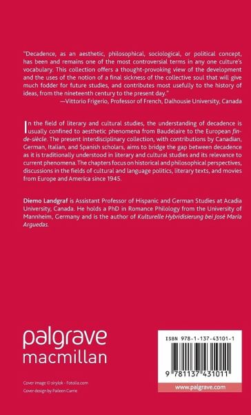 "Decadence, as an aesthetic, philosophical, sociological or political concept, has been and remains one of the most controversial terms in any one culture's vocabulary. This collection offers a thought-provoking view of the development and the uses of the notion of a final sickness of the collective soul that will give much fodder for future studies, and contributes most usefully to the history of ideas, from the nineteenth century to the present day." - Vittorio Frigerio, Professor of French, Dalhousie University, Canada