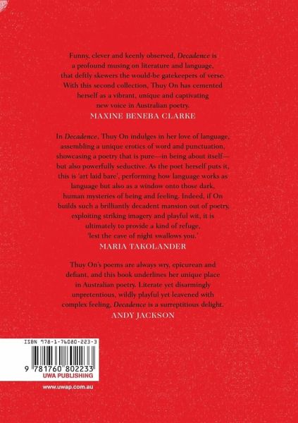 Funny, clever and keenly observed, Decadence is a profound musing on literature and language, that deftly skewers the would-be gatekeepers of verse. With this second collection, Thuy On has cemented herself as a vibrant, unique and captivating new voice in Australian poetry. - MAXINE BENEBA CLARKE In Decadence, Thuy On indulges in her love of language, assembling a unique erotics of word and punctuation, showcasing a poetry that is pure-in being about itself-but also powerfully seductive. As the poet herself puts it, this is 'art laid bare', performing how language works as language but also as a window onto those dark, human mysteries of being and feeling. Indeed, if On builds such a brilliantly decadent mansion out of poetry, exploiting striking imagery and playful wit, it is ultimately to provide a kind of refuge, 'lest the cave of night swallows you.' - MARIA TAKOLANDER Thuy On's poems are always wry, epicurean and defiant, and this book underlines her unique place in Australian poetry. Literate yet disarmingly unpretentious, wildly playful yet leavened with complex feeling, Decadence is a surreptitious delight. - ANDY JACKSON
