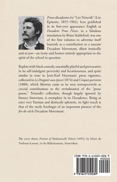 Proses Décadentes by "Léo Trézenik" (Léo Épinette, 1855-1902), here published in its first-ever appearance English as Decadent Prose Pieces, in a fabulous translation by Brian Stableford, was one of the first volumes to advertise itself brazenly as a contribution to a nascent Decadent Movement, albeit ironically and in jest—an irony and humor entirely appropriate to the spirit of the school in question. Replete with black comedy, essentially playful and provocative in its self-indulgent perversity and licentiousness, and quite similar in tone to Joris-Karl Huysmans’ prose vignettes, collected in Le Drageoir aux épices (1874) and Croquis parisiens (1880), which likewise came to be seen retrospectively as crucial contributions to the revitalization of the "prose poem," Trézenik’s collection, though largely ignored by literary historians, is exemplary in its Decadence. Being at once very Parisian and distinctly splenetic, its light touch is that of the steely forefinger of an important pioneer of the fin-de-siècle Decadent Movement.