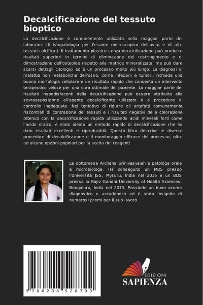 La decalcificazione è comunemente utilizzata nella maggior parte dei laboratori di istopatologia per l'esame microscopico dell'osso e di altri tessuti calcificati. Il trattamento plastico senza decalcificazione può produrre risultati superiori in termini di eliminazione del restringimento e di dimostrazione dell'osteoide rispetto alla matrice mineralizzata, ma può dare scarsi dettagli citologici ed è un processo molto più lungo. La diagnosi di malattie non metaboliche dell'osso, come infezioni e tumori, richiede una buona morfologia cellulare e un risultato rapido che consenta un intervento terapeutico veloce per una cura ottimale del paziente. La maggior parte dei risultati insoddisfacenti della decalcificazione può essere attribuita alla sovraesposizione all'agente decalcificante utilizzato e a procedure di controllo inadeguate. Nel tentativo di ridurre gli artefatti comunemente riscontrati di contrazione dei tessuti e i risultati negativi della colorazione ottenuti con la decalcificazione rapida utilizzando acidi minerali forti come l'acido nitrico, è stato ideato un metodo rapido di decalcificazione che ha dato risultati eccellenti e riproducibili. Questo libro descrive le diverse procedure di decalcificazione e il monitoraggio efficace del processo, oltre ad alcune opzioni popolari per la scelta dei reagenti.