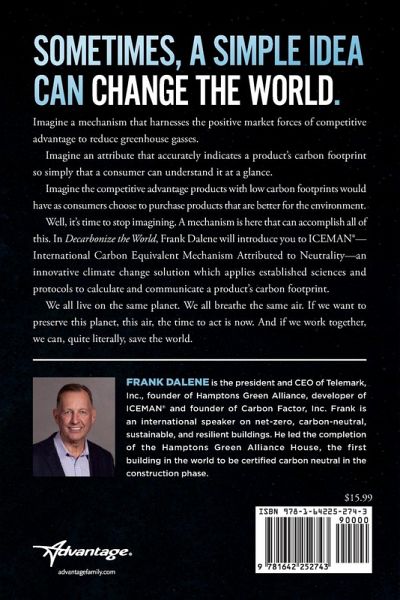 Amazon Best Seller in Green Business & Environmental Economics SOMETIMES, A SIMPLE IDEA CAN CHANGE THE WORLD.Imagine a mechanism that harnesses the positive market forces of competitive advantage to reduce greenhouse gasses. Imagine an attribute that accurately indicates a product's carbon footprint so simply that a consumer can understand it at a glance. Imagine the competitive advantage products with low carbon footprints would have as consumers choose to purchase products that are better for the environment. Well, it's time to stop imagining. A mechanism is here that can accomplish all of this. In Decarbonize the World, Frank Dalene will introduce you to ICEMAN®- International Carbon Equivalent Mechanism Attributed to Neutrality-an innovative climate change solution which applies established sciences and protocols to calculate and communicate a product's carbon footprint. We all live on the same planet. We all breathe the same air. If we want to preserve this planet, this air, the time to act is now. And if we work together, we can, quite literally, save the world.