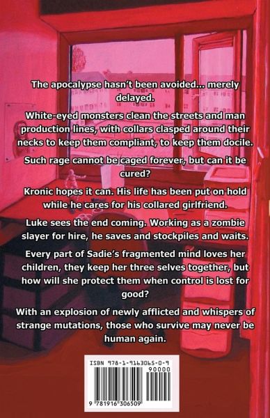 When control of the infected fades, their murderous rage will be unleashed. Luke is a vigilante zombie killer for hire. He sees what most people refuse to in the white eyes he shuts - the end. With collars failing, and infected roaming he will need all his skills to survive. Strange mutations will spread through the survivors, twisting them into unrecognisable forms. Some abilities will be a gift, some will be a curse. The only thing mutants will retain is their humanity, and even that is on the line in the struggle for survival. Every part of Sadie's fragmented mind loves her children, they keep her three selves together. From her top floor windows, she will watch the world devolve into chaos and must wrestle with the voices to stop the same thing happening in her mind. The people who cross the street to avoid him, don't know that Kronic gave up everything to look after his collared girlfriend, all they see is his size and tattoos. Kronic holds out hope for a cure, the alternative is too horrible to imagine. In this ultimate war against a looming end, some fight for a cure, most fight to survive, and one revels in the destruction they have caused.