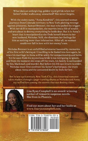 What does an unforgiving, golden-eyed girl do when her father's killer walks away unscathed? She never forgets. With the stolen name, "Anna Kendrick", this scorned woman journeys from Colorado territory to New York plotting revenge against aristocrat, Samuel Brenner, the man who pulled the trigger. With her skill in manipulation, she marries into a life of wealth and sets about to destroy everything he holds dear. But it is Anna's heart that is manipulated as she finds herself drawn to her new husband, Nicholas. Still, she dismisses her feelings for him as nothing more than infatuation. After all, no woman could ever fall in love with her enemy's son. Nicholas Brenner is an unfulfilled aristocrat haunted by memories of his first wife's betrayal. Unwilling to be fooled into love again, he vows his marriage to Anna will be solely for companionship and heirs. Yet he soon finds his mysterious bride is too intriguing to ignore, and from the moment she steps off the train, his family is surrounded by lies, blackmail, and murder. But before his life can return to order, Nicholas must first confront his father's buried past, the truth about Anna and the unwanted desire he feels for her. Set in late 19th century New York City, this historical romance takes readers through a page-turning drama as Nicholas and Anna try to find love among the secrets that can destroy them.